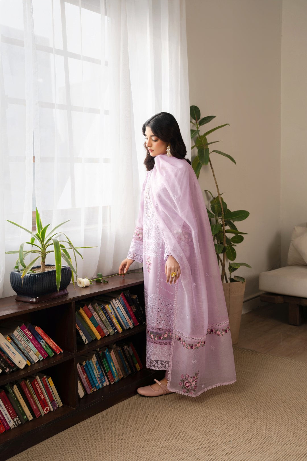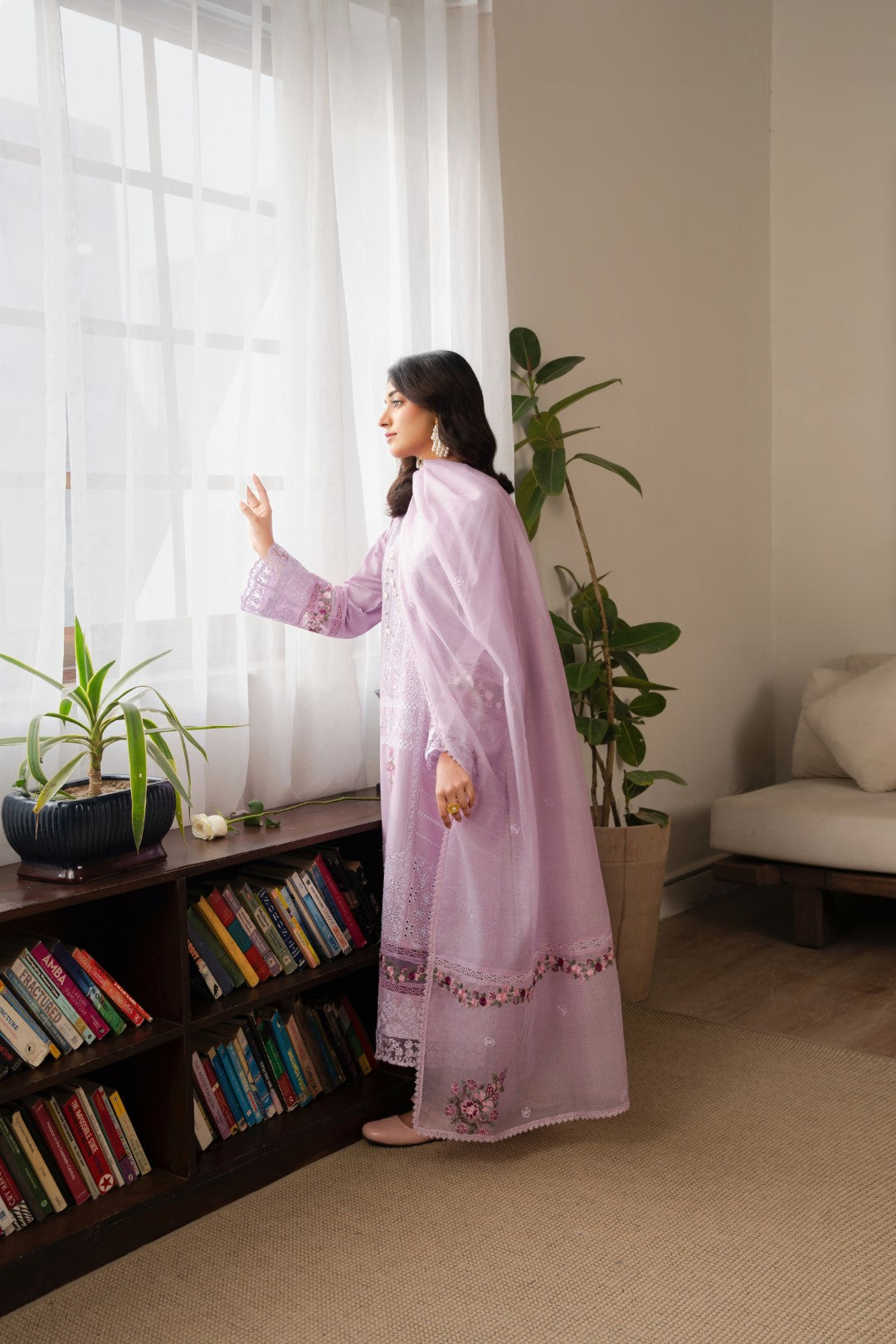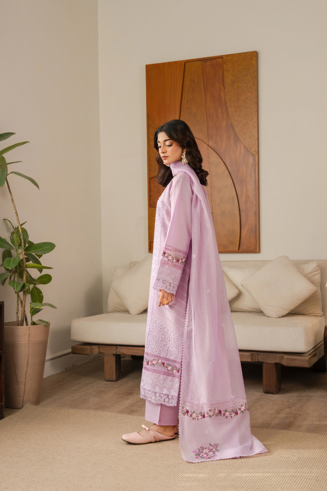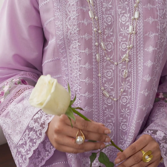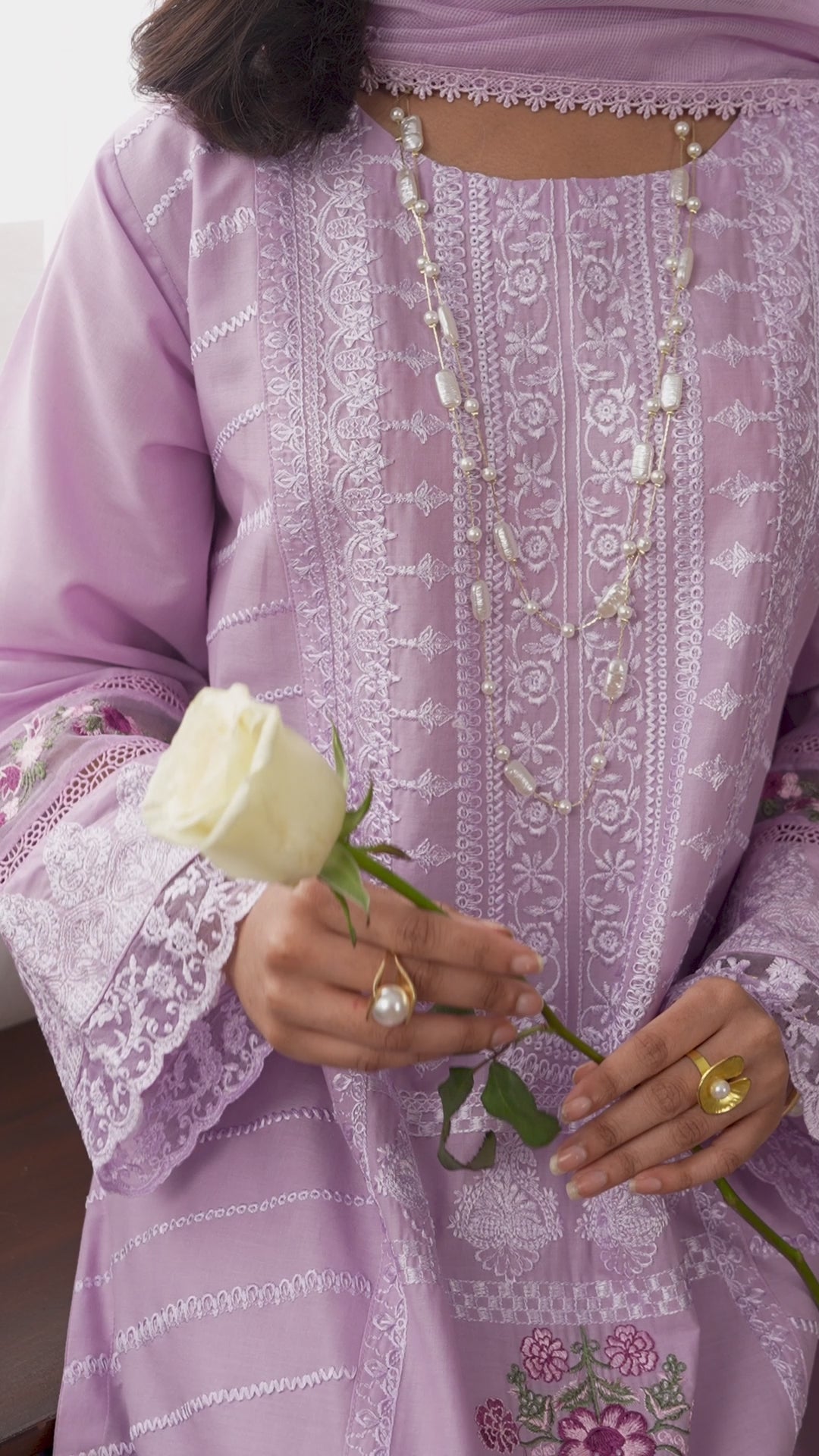 Timeless and sophisticated, this dress features same-on-same embroidery for depth and elegance. This ensemble is crafted with precision from finest of fabrics. contrast embroidered organza patches with intricate laces details on the sleeves & shirt border add an extra touch of sophistication. it’s paired with plain trouser and a stunning embroidered dupatta adorned with laces, this ensemble offers the perfect blend of elegance and luxury.