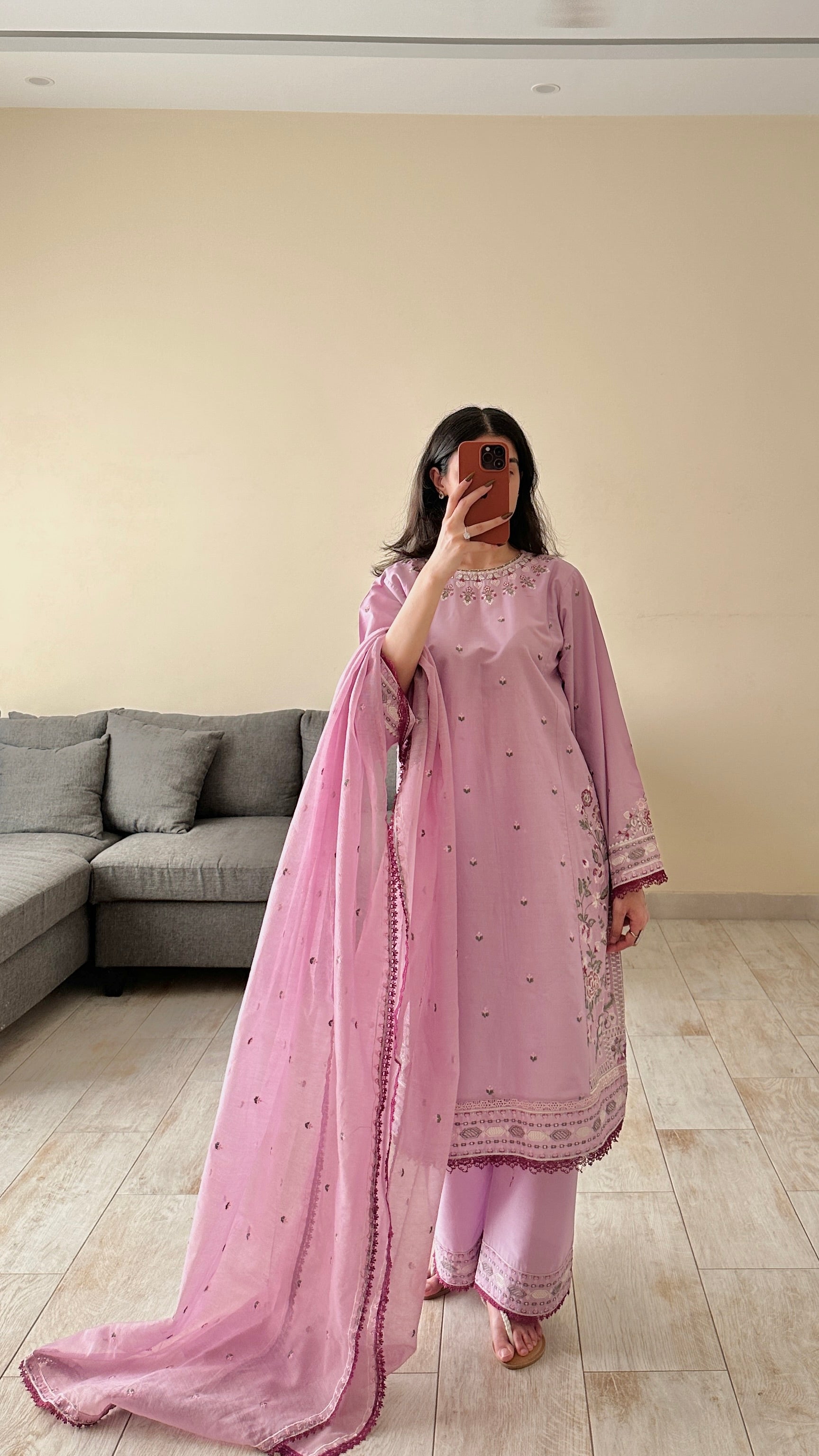 Embrace elegance in this lawn dress, featuring delicate floral embroidery and timeless craftsmanship. Crafted from finest of fabrics, it’s paired with embroidered trouser and a stunning embroidered dupatta adorned with laces, this ensemble offers the perfect blend of comfort and luxury.