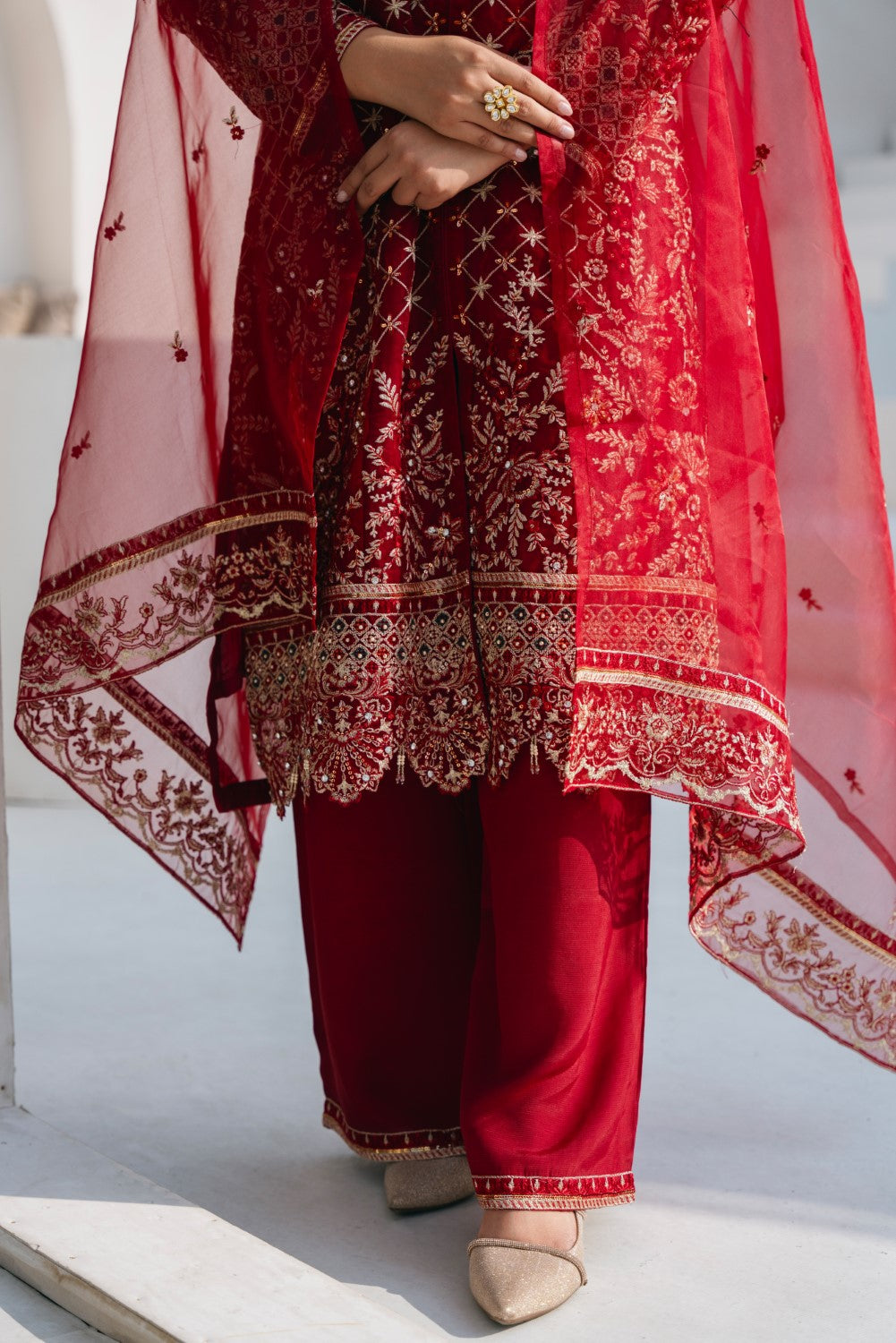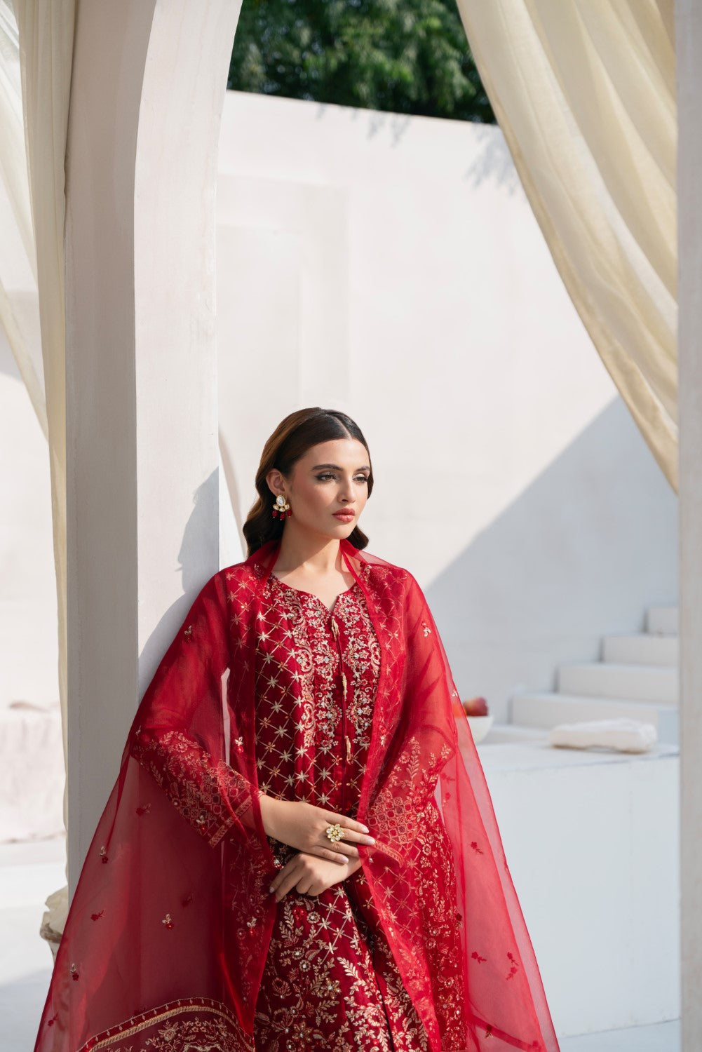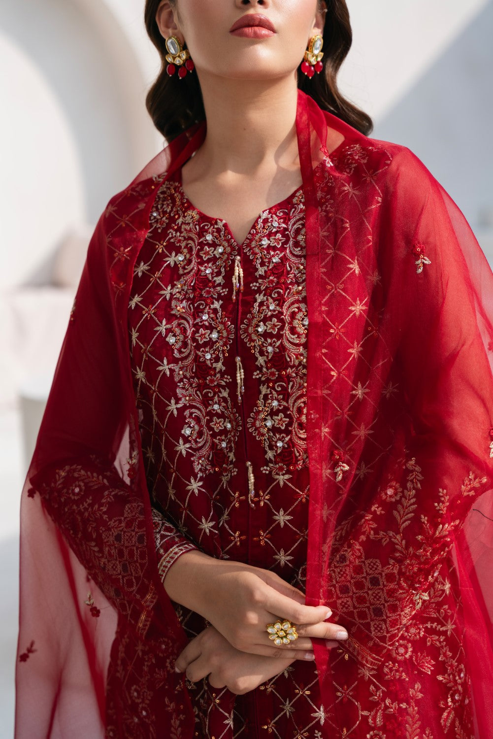 An unmatched embroidery with delicate adda work on maroon organza shirt with an open style, gracefully paired with embroidered trouser. embroidered dupatta elevating your fashion quotient to celestial peaks