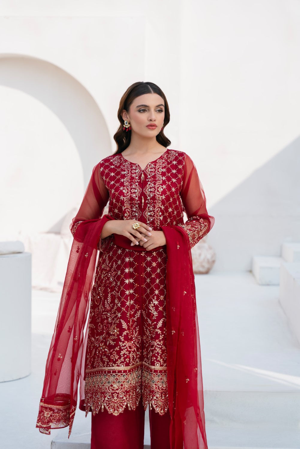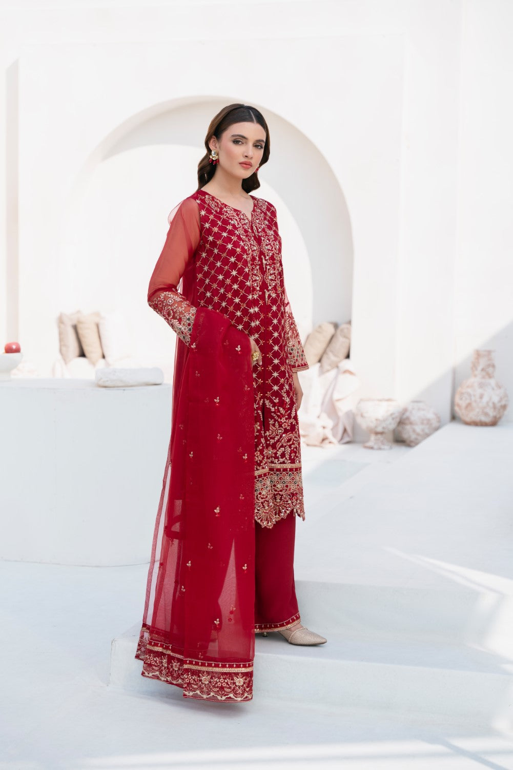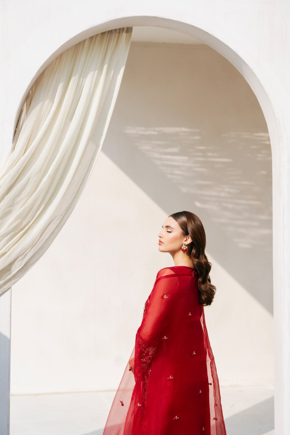 An unmatched embroidery with delicate adda work on maroon organza shirt with an open style, gracefully paired with embroidered trouser. embroidered dupatta elevating your fashion quotient to celestial peaks