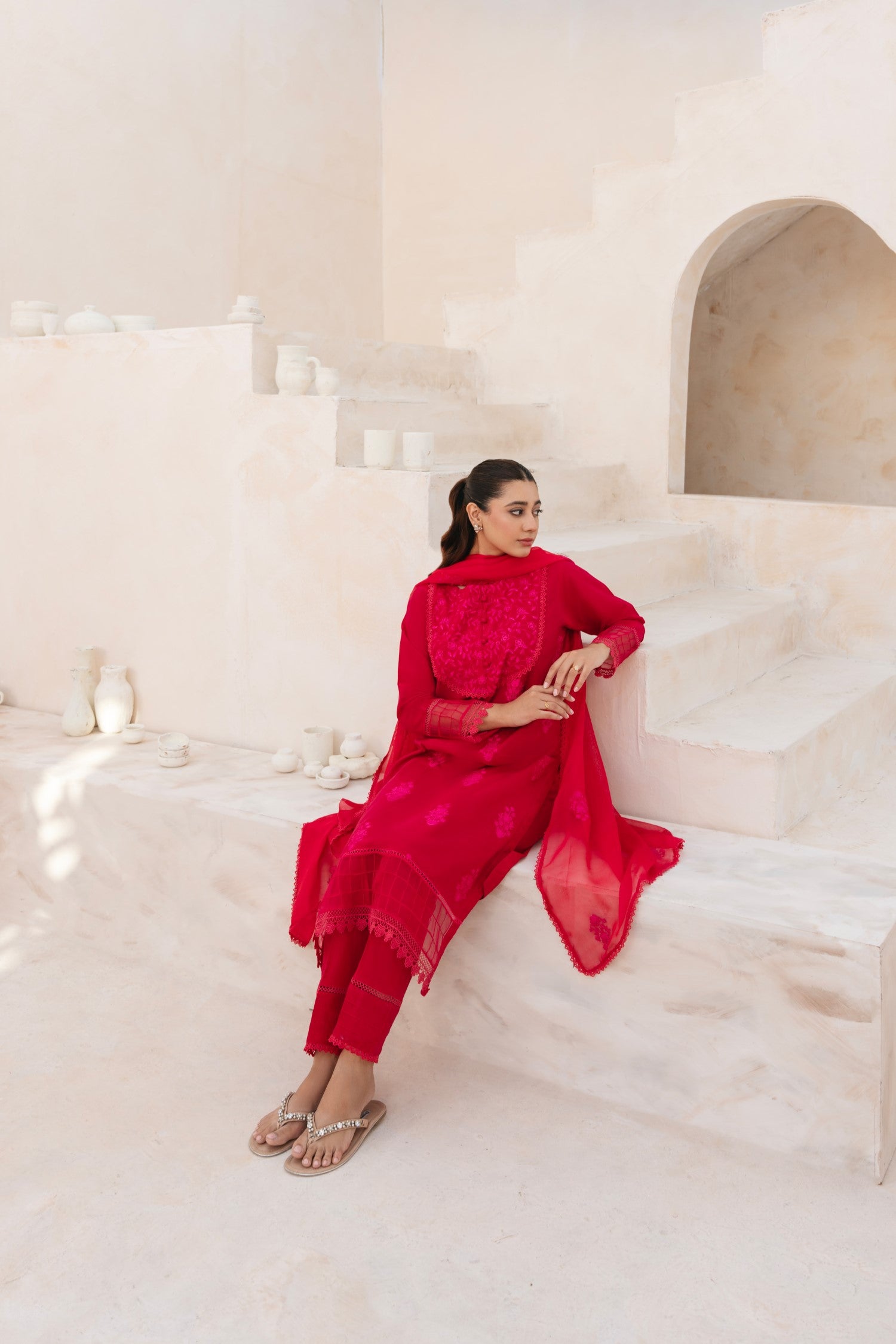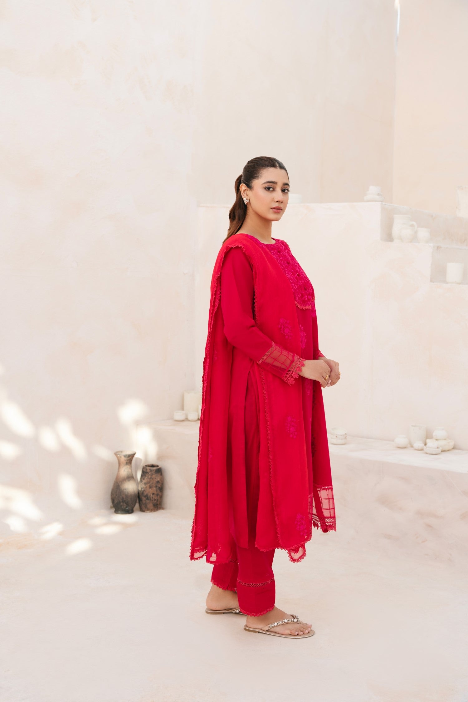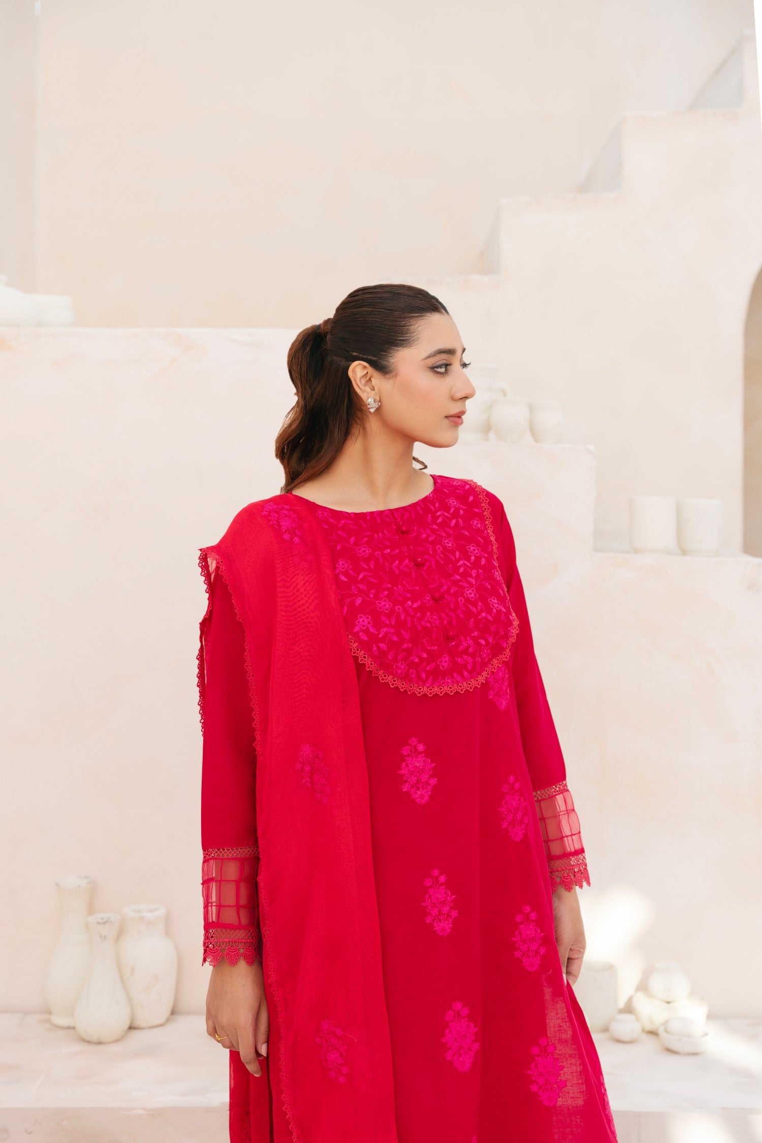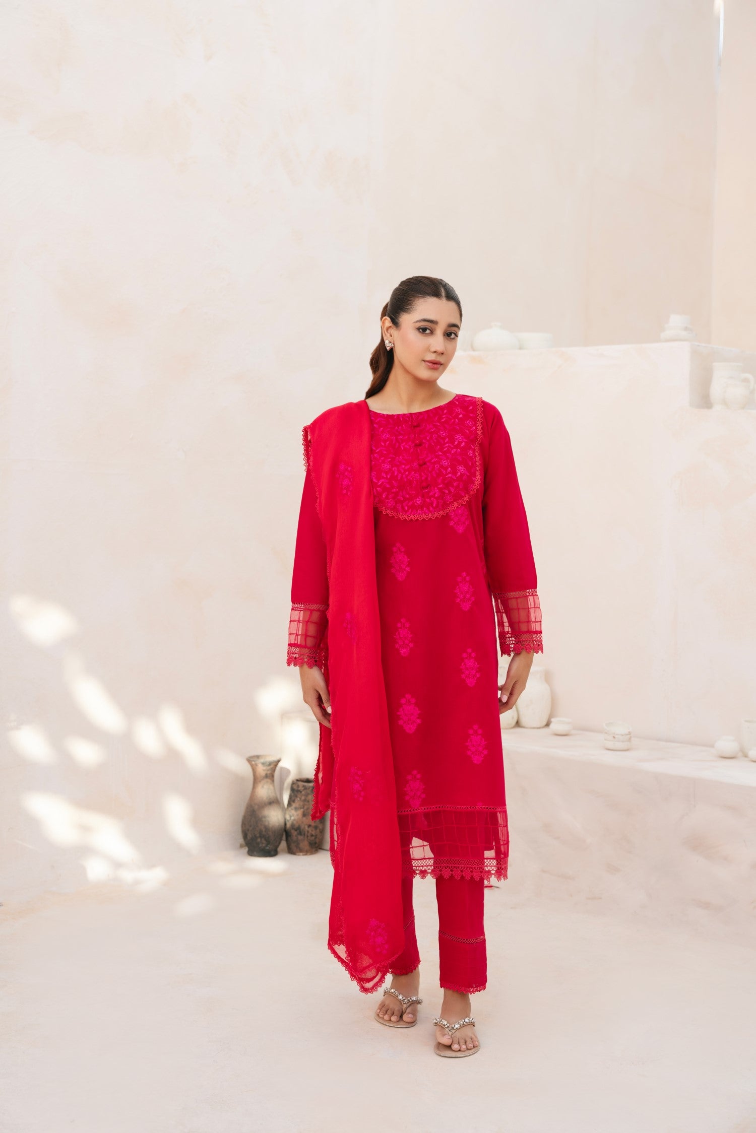 Timeless and sophisticated, this dress features same-on-same thread embroidery for depth and elegance. The stunning stitching details with lace work on shirt enhances the overall sublime look. the Paired with embroidered slub dupatta and plain cotton trousers, it’s a refined celebration of understated luxury.