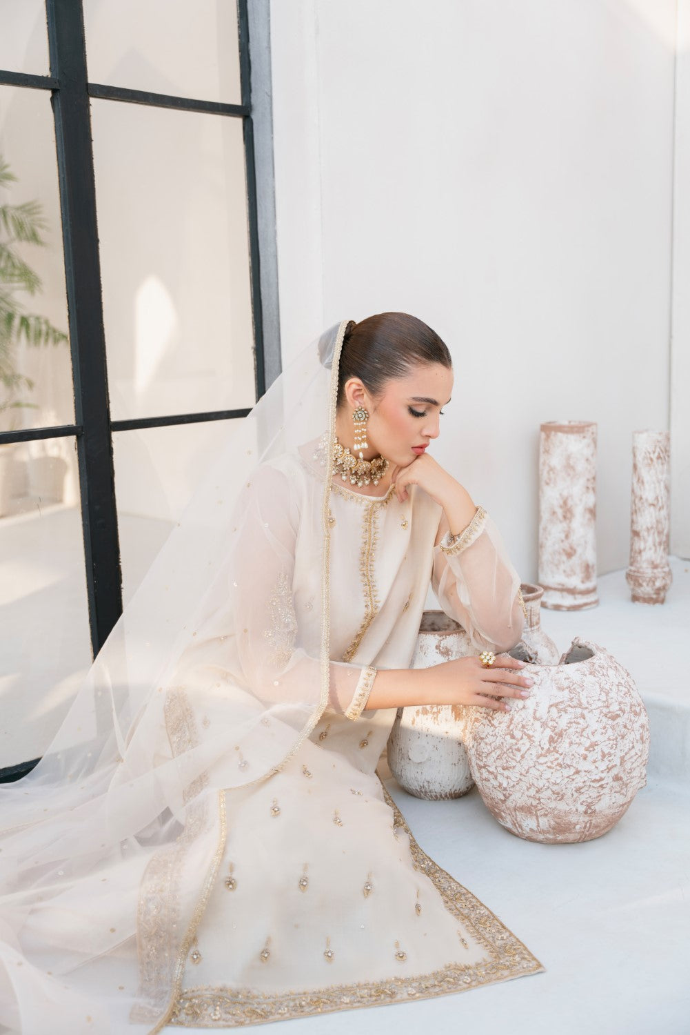 This ensemble features stunning embroidery of hand zardozi,dabka and most elegant zari tilla. The overall look is elevated with hand embroidered sleeves . paired with elaborated embroidered dupatta adorned by laces. This outfit is delight for festive occasions